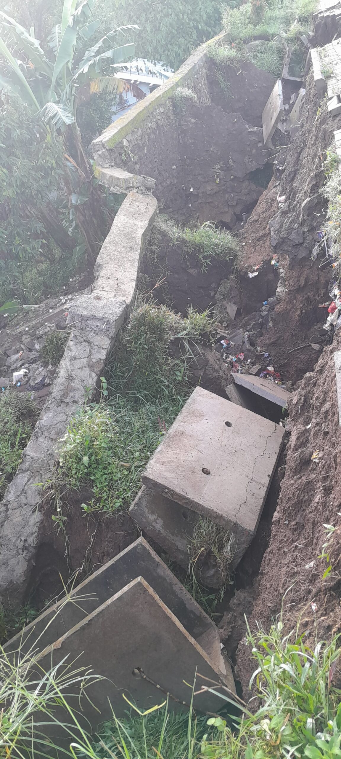 Diduga, ambruknya TPT dipicu oleh tersumbatnya saluran drainase, sehingga aliran air tidak berjalan lancar dan menekan struktur penahan tanah hingga akhirnya tidak mampu menahan beban.